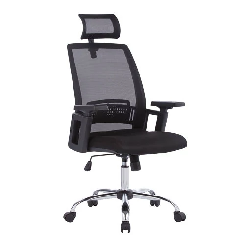 Fekete, ergonomikus, állítható hálós háttámlás vezetői fotel nagy sűrűségű habszivacs párnával, mely kényelmes és lélegző, hosszú ülés után sem deformálódik. Állítható fejtámlával, deréktámasszal és magasságában állítható, puha kárpitozású kartámasszal. Krómozott fém talp. D.50 görgők. Teljes magasság: 115-124,5 cm. Ülésmagasság: 48-57,5 cm. Teljes szélesség: 70 cm. Ülésszélesség: 48 cm. Ülésmélység: 47 cm. Teherbírás: 136 kg