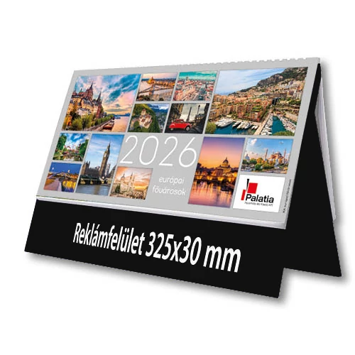 Álló, műbőrös naptárháttal. 27 lapos. Mérete: 325 x 155 mm. Reklámfelület mérete: 325 x 30 mm.