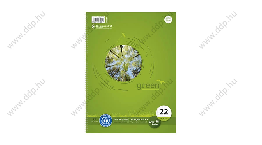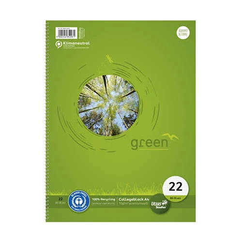 Kiváló minőségű, 70 g-os papírból készült, 80 lapos, ponthálós spirálfüzet, 100%-ig újrahasznosított. A prémium minőségű fehér lapok opikai fehérítő nélküliek és klórmentesek. A termék Blue Angel, Osztrák ÖKO címkével és Nordi Swan tanúsítvánnyal is rendelkezik. A gyártási folyamat TÜV által ellenőrzött. Ez az osztrák minőségi termék 100%-ban éghajlat semleges és környzetbarát. Perforált és lyukasztott.