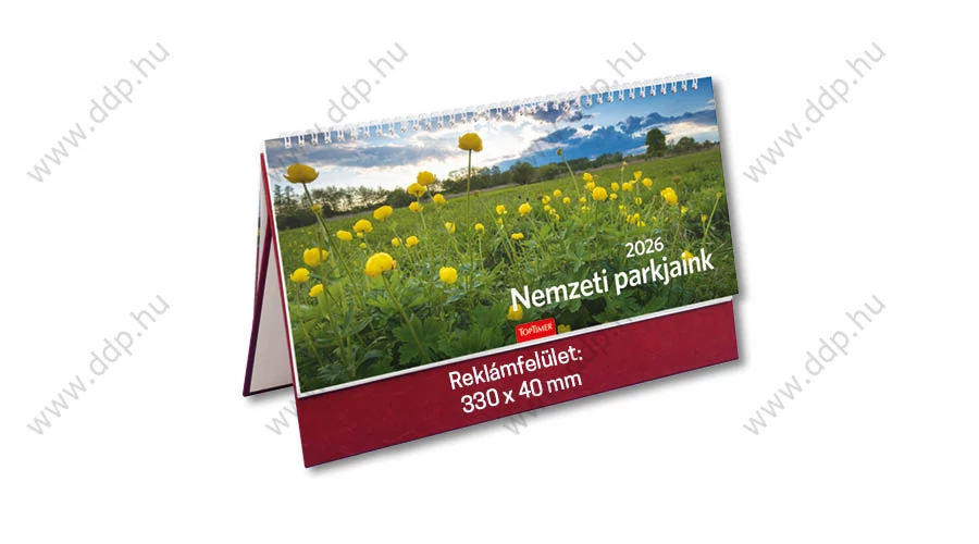 Műbőr táblával készült, fehér tömbös, álló, 58 lapos képes csonkalapos asztali naptár heti beosztással. Havonta 1 hosszú lap! Szitázással, présfólia- és vaknyomással emblémázható. Naptárbeosztás: 6-22 óráig, 8-18 óráig félórás beosztással. Mérete: 325 x 155 mm. Reklámfelület mérete: 330 x 40 mm.